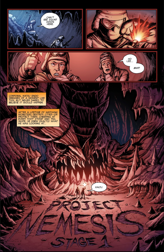 The first prologue takes place five years in Alaska during a military training exercise. We meet Master Sargent Lenny Wilson and Corporal Endo Katsu, a Japanese soldier on loan from the JSDF in a foreign exchange program, taking part in a militarized version of hide and seek, using the heavy snow as cover. Wilson, as we find out, is something of a racist, constantly calling Endo “Ketchup” and going as far as calling the Japanese military a vassal army to the US. I’m not going to even begin to go into how wrong that is and just continue. They get caught by the other team and start heading higher into the mountain ridge until Endo falls into a hole. After a minute, Wilson goes down into the hole, where it leads them into a deep, dank, super freaking cold cave. But instead of finding Gollum and playing riddles in the dark, Endo lights up a flare, and to his and his partner’s shock and amazement, finds the skeletal remains of a kaiju.