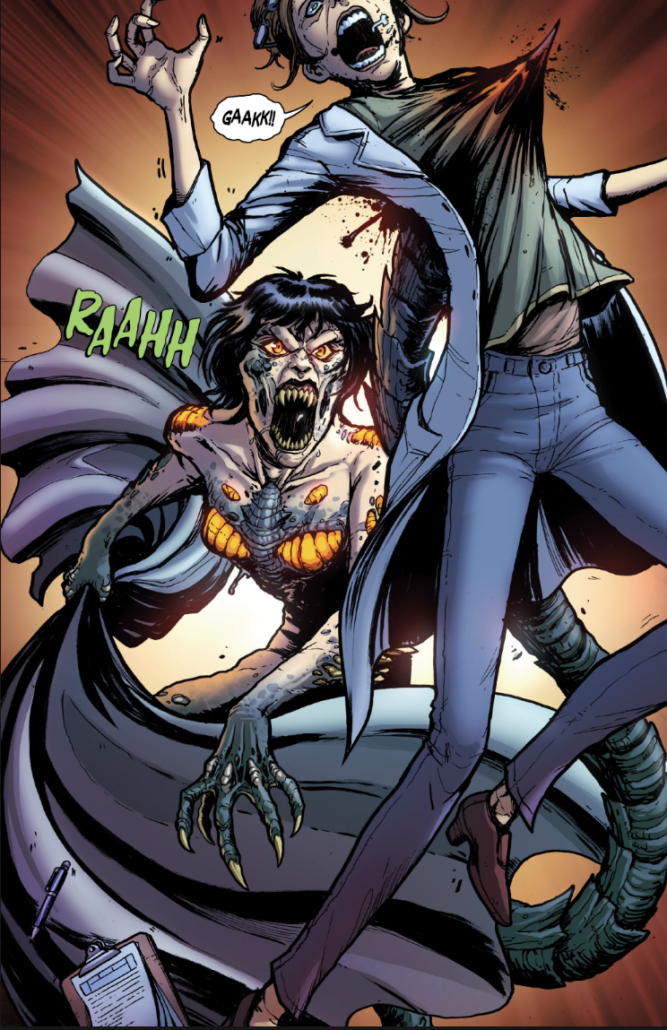 They tell him they were investigating the bear sittings, playing the Fish and Wildlife Services card, but the clearly not an undercover soldier isn’t buying it so the pair leave. Only to find Mr. Johnson shot and killed by a sound suppressed weapon. Hudson and Collins find themselves in the middle of a chase, as the faux redneck brings his buddies and start shooting at them. After a tussle down a ledge and shooting some of them, our heroes see smoke billowing in the distance. They go over in the direction of the smoke and find some of the undercover soldiers eaten and torn to pieces. It’s obvious to Hudson it’s not a bear and it’s big, leaving large chunks of molting skin. As the two make it to the facility, the thing that has left a slew of bodies and destruction comes back and let me tell you she is still hungry. Hudson and Collins are chased once again, this time by a creature with glowing yellow membranes all over her. And yes, it is a “her”. Maigo’s clone, thanks to the kaiju DNA, has begun mutating into a monster forever known as Nemesis, as written in Greek on the wall next to the late Dr. Elliot in blood.