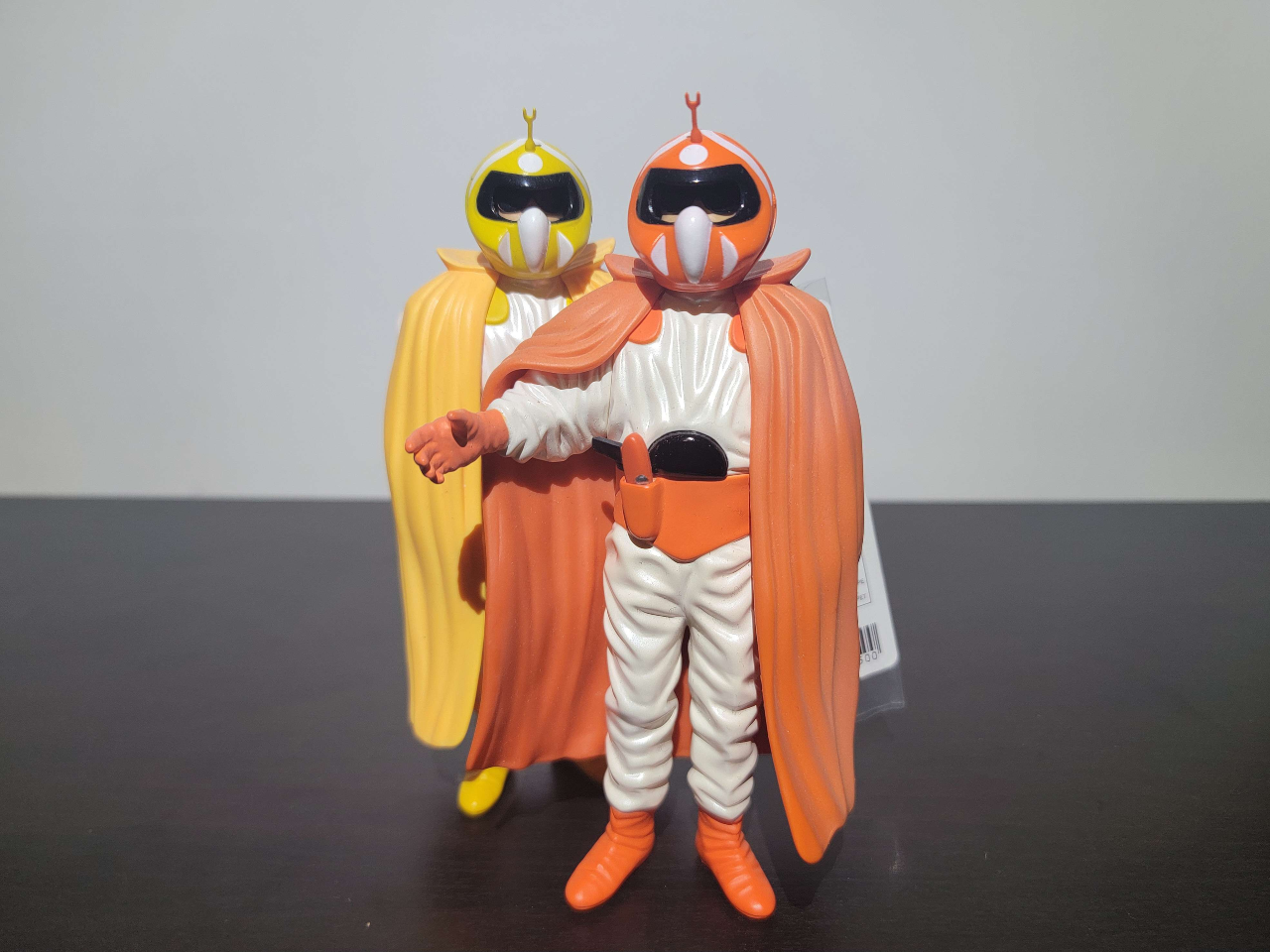 One of my personal favorite ongoing toy lines is the recent Toho Maniacs series by X-Plus. As someone who has a very deep love for Toho’s non-Godzilla content, it’s a blessing to have Toho Maniacs give us releases from films like Matango and The Mysterians. We have both the Mysterian Leader (orange) and a an intermediate-ranking Mysterian (yellow).