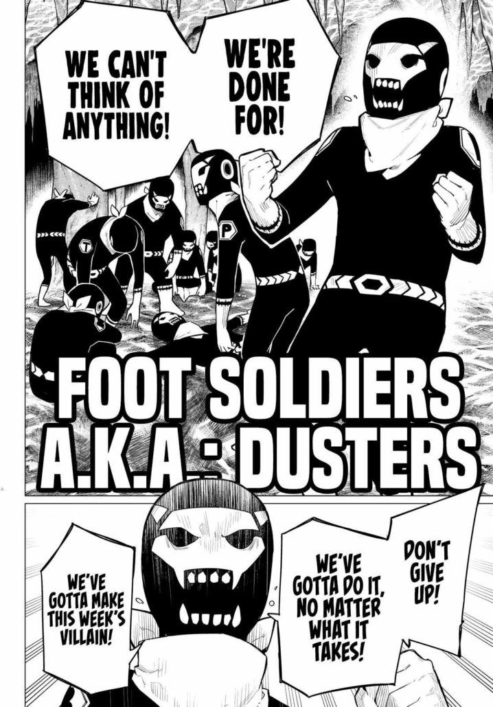 We cut ten hours before inside the fortress that reflects its rocky exterior resembling somewhat of a cave. Inside we meet our gang of foot soldiers, the Dusters. I love the simplicity of their costume designs, from their bandanas to the faces resembling demon or Oni with how the horns and fangs are angled. Their name and black and white tights may have come from Dinniman’s foot soldiers, the Dustlers, who may have been inspiration. The Dusters are freaking out and panicking because they’ve run out of ideas on how to fight the heroes. 13 years is a very long time to be spending on coming up with weekly plans to eliminate your enemies. The well is so dry at this point they have no idea what to do.
