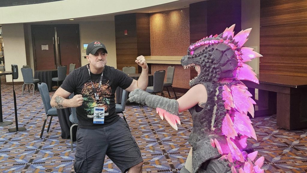 Remember how much we talked about the epic dealers room last year? Well, this time, there were two! Kaiju World was the bigger room with more Godzilla figurines and collectibles than you could ever imagine. There were the familiar faces like Clawmark Toys, Radioactive Toys, Aardvark Tees, Titanic Creations, and Toku Toy Town, all with even better selections than last year! Toku Toy Town’s booth in particular had a massive upgrade, with a beautiful archway inviting you in to check out their lineup of sofubi. Dopepope also made his grand return to the convention after not appearing since 2019. It was fantastic to talk to him briefly about his epic work designing toys and creatures for movies! I want to specifically recognize David Nunes for keeping the lines flowing, attendees excited, and for his work in efficiently managing the biggest line I’ve ever seen at a G-FEST. David’s a trooper and the show would not run as well as it does without his tremendous efforts.