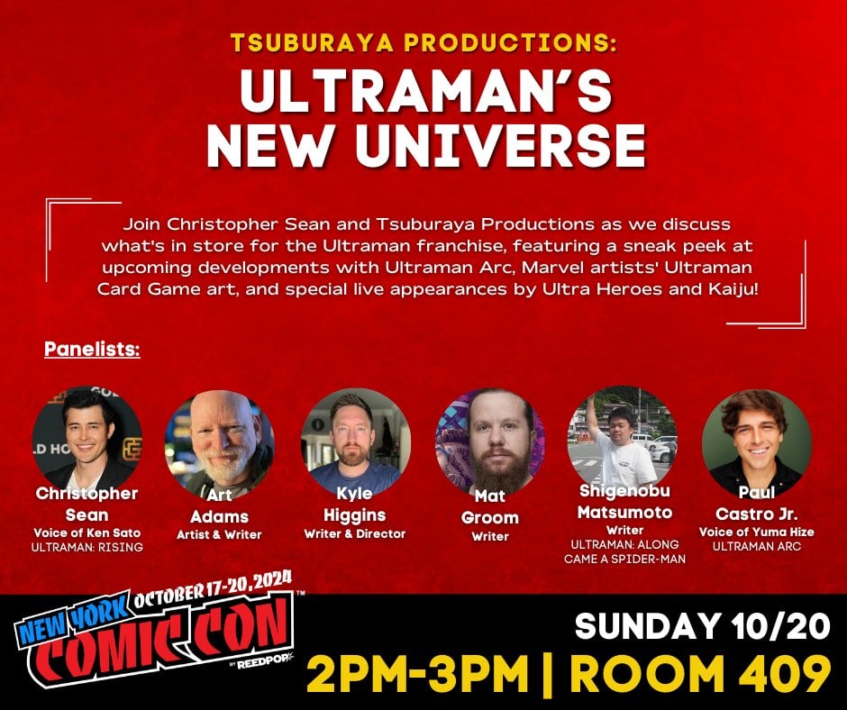Join Christopher Sean (voice of Ken Sato, Ultraman: Rising) and Tsuburaya Productions as we reveal what’s in store for the Ultraman franchise in North America. Featuring a sneak peek at upcoming developments with Ultraman Arc, Marvel superstar Art Adams unveiling his gorgeous Ultraman Card Game art, Marvel writers Kyle Higgins & Mat Groom providing a glimpse of the latest Ultraman X Avengers pages, and special live appearances by Ultra Heroes and Kaiju! Have your cameras ready!