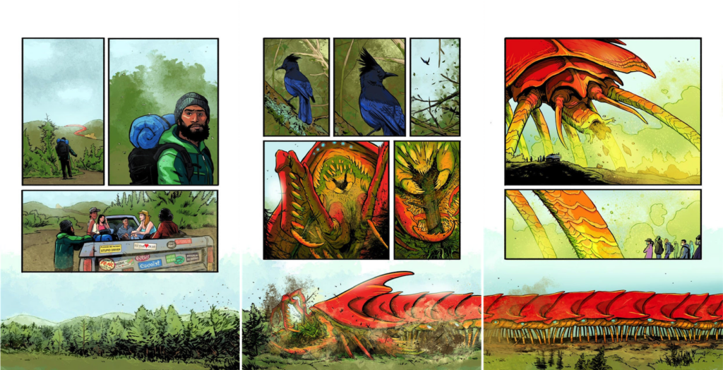 RR: First, all of the artists that I have worked with are incredible. If you love comic art and you love cool monster designs, I feel like you’ll really enjoy this. Additionally, what’s set Stomped apart from other kaiju comics and film, is what I was talking about earlier, where I initially started this project and continued to draw from influences that were like outside of the kaiju sphere, pulling from a wider range of influences. I think if people are looking for something a little bit different than an IDW Godzilla comic, or something that’s a little more grounded and less punchy and wrestling-esque, this book is for you. Our story is grounded without being embarrassed by the tropes of kaiju. I genuinely love Godzilla, Gamera, and King Kong. Of course, my love also extends to more recent movies like Pacific Rim, The Host, and Cloverfield, too. I love it all; I’m putting all of that into a blender and giving it a little bit more of a person on the ground kind of perspective.