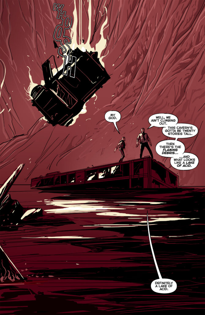 On the art front, Jay Martin has cemented himself as one of the most impressive illustrators to work on a Kaiju comic book. Switching it up this time, Mr. Martin goes from epic, sweeping splash pages showing us the outside of the kaiju (with visuals very familiar to devoted genre fans) to smaller, more tense, and revolting once we are “eaten” alongside the characters. Jay’s choices with colors and shadows are so visually striking, with unique vehicles and human beings standing out perfectly despite being in a place with very little to no light. The sense of scale is not forgotten as well; the cavernous stomach still feels massive, especially in that page with the falling, flaming car and the reveal of the acid lake. I can’t reveal too much about what else Jay’s bringing to the table without spoiling, but we have some fun intestinal roommates that surprise us within the monster, and they’re right up there with the Cloverfield parasites as some of the freakiest little buggers in a monster story.