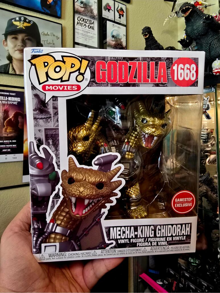 Godzilla has been celebrating 70 years and Funko has been right behind it, bringing in some of the cutest and coolest little collectibles that you can find currently on the market. The one I want to highlight today is going to be one of my top favorites from the recently released waves of POPs – the GameStop exclusive Jumbo Funko Pop Mecha-King Ghidorah. Now I know we can have 100s to 1000s of Funko Pops in our collections, but I will be honest with you right now. When it comes to Funko Pops and Godzilla, you can never have enough kaiju pops invading your collection (seriously, it’s crazy). The Mecha-Ghidorah Funko Pop is a GameStop exclusive and is one of the coolest character designs (in my opinion) in Godzilla villain history. Mecha-King Ghidorah is from the 90’s series of Godzilla films and is one of the best King Ghidorah iterations throughout the generations of designs.
