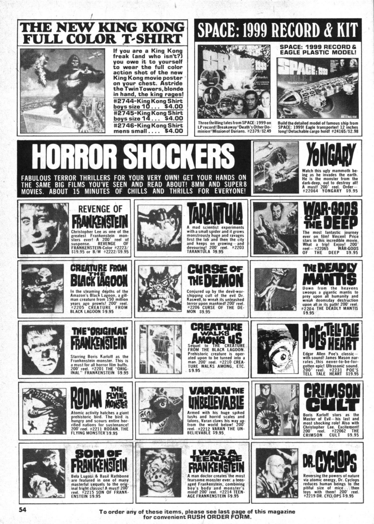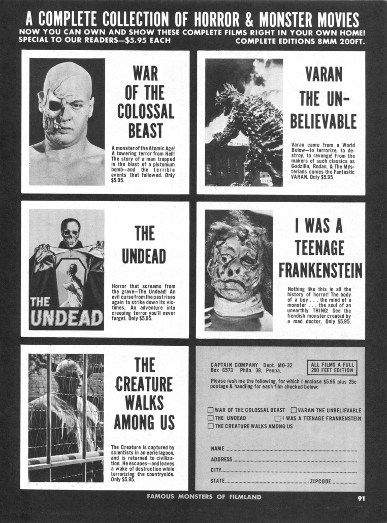 These were often advertised in genre magazines like Famous Monsters of Filmland, reaching monster sci-fi fans directly through mail-order.