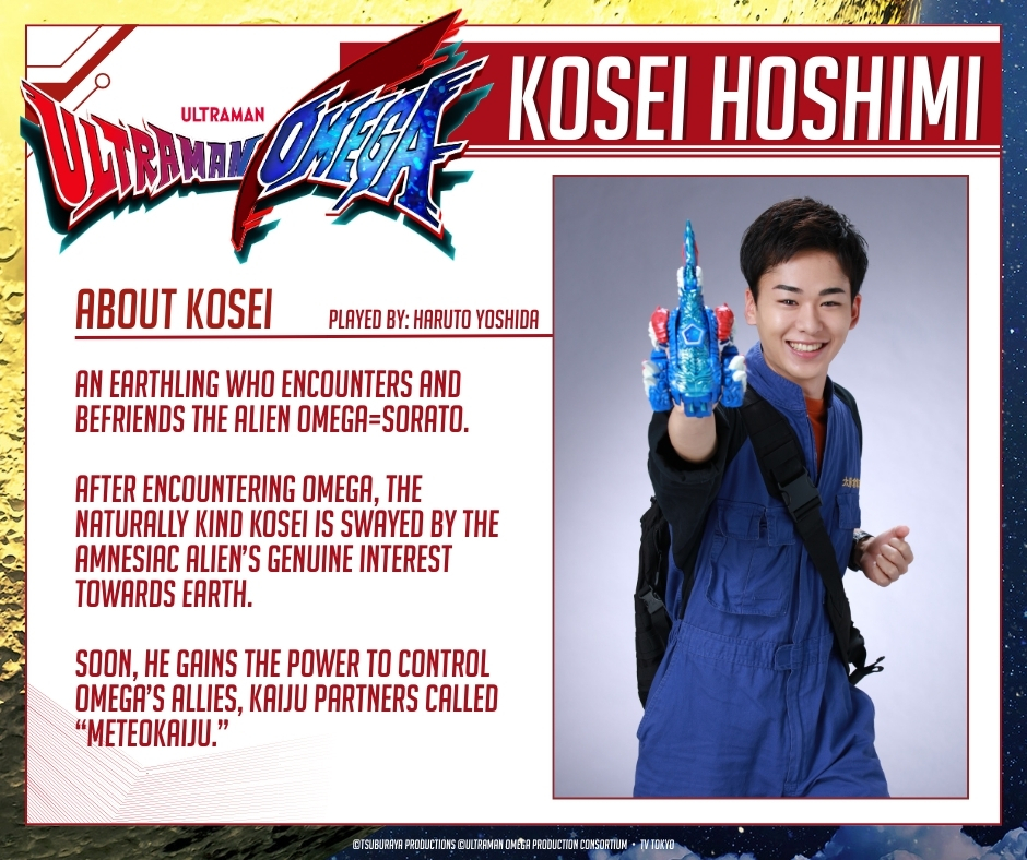 Kosei Hoshimi, portrayed by young actor Haruto Yoshida, is the latest character to join the Ultraman Omega roster. An Earthling who encounters the alien Omega (Sorato), Kosei is a kind-hearted part-time live-in warehouse caretaker who’s uncertain about his future. After befriending the amnesiac Sorato, Kosei becomes inspired by Omega’s genuine curiosity and concern for Earth, ultimately deciding to support him.