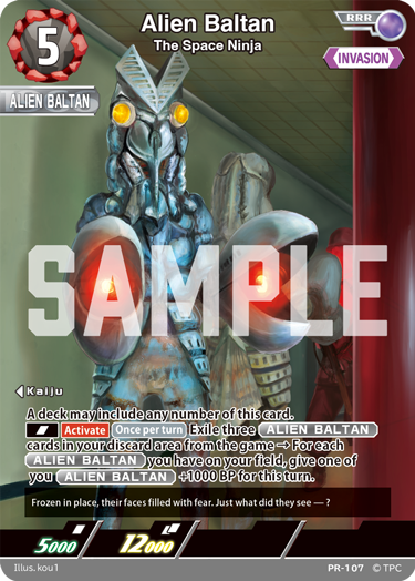 - Box Topper: Alien Baltan, the Space Ninja. A card that allows multiple copies per deck, featuring Baltan’s signature duplication move and red freezing ray attack.