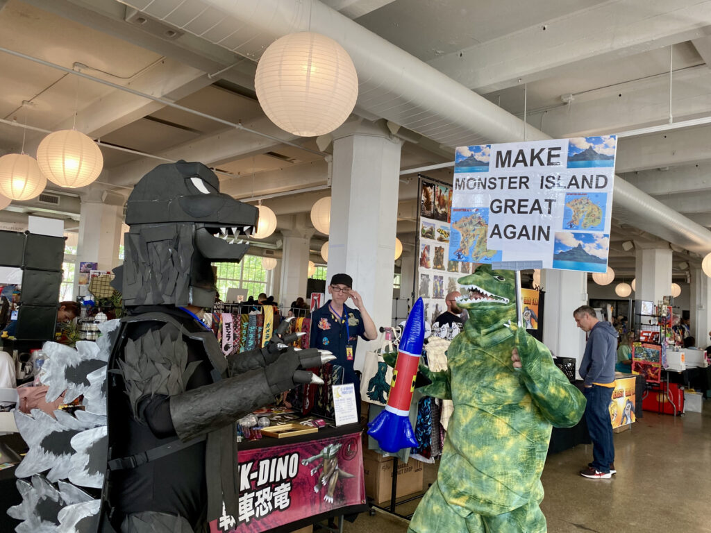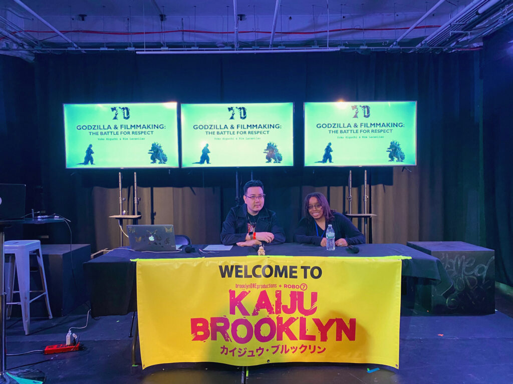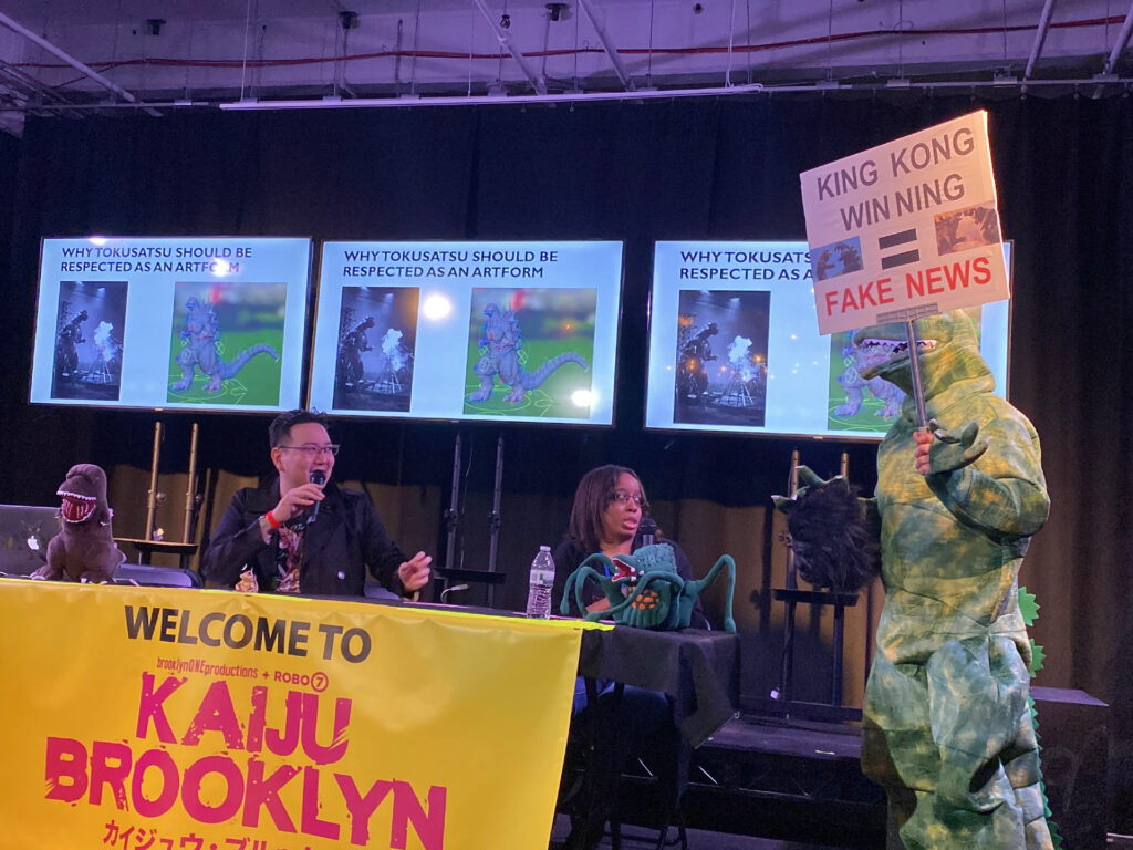 Another standout panel was Godzilla & Filmmaking: The Battle for Respect with Yoko Higuchi and Kim Lacnilao (KaijuKim). The panel touched on how Godzilla and Tokusatsu are often overlooked or condescended to in mainstream media, especially compared to more “accepted” franchises like King Kong. It was thought-provoking and fun! Especially when a guy in a Godzilla PJ suit crashed the panel with a “KING KONG WINNING = FAKE NEWS” sign (the same guy that had the funny “Make Monster Island Great Again” sign from the first KB event!).