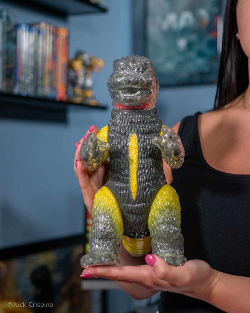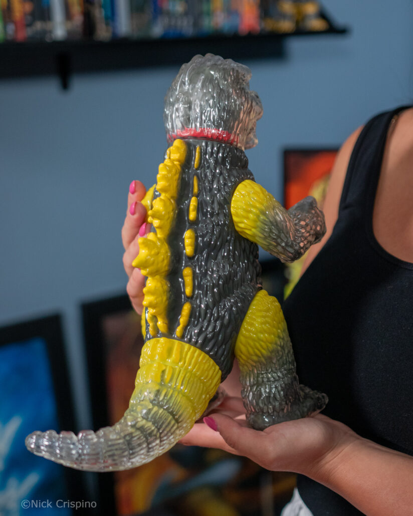 The first colorway option available to collectors is a dazzling canary yellow that brilliantly contrasts Godzilla’s charcoal grey coloration. Godzilla’s dorsal spines, tail, and limbs are given a dash of yellow that seamlessly transitions into the figure’s translucent features. The second colorway option available to collectors is a “glow” red that gives a clever homage to Godzilla’s “Burning” appearance in 1995’s Godzilla vs. Destoroyah, giving a fun 2-in-1 for different eras in the Godzilla series. Both figures’ colorways also match up with the Godzilla x Puma x Atmos x Secret Base Puma Suede shoes released alongside the sofubi figure, bringing an awesome blend of collectibility and fashionable style never before seen.