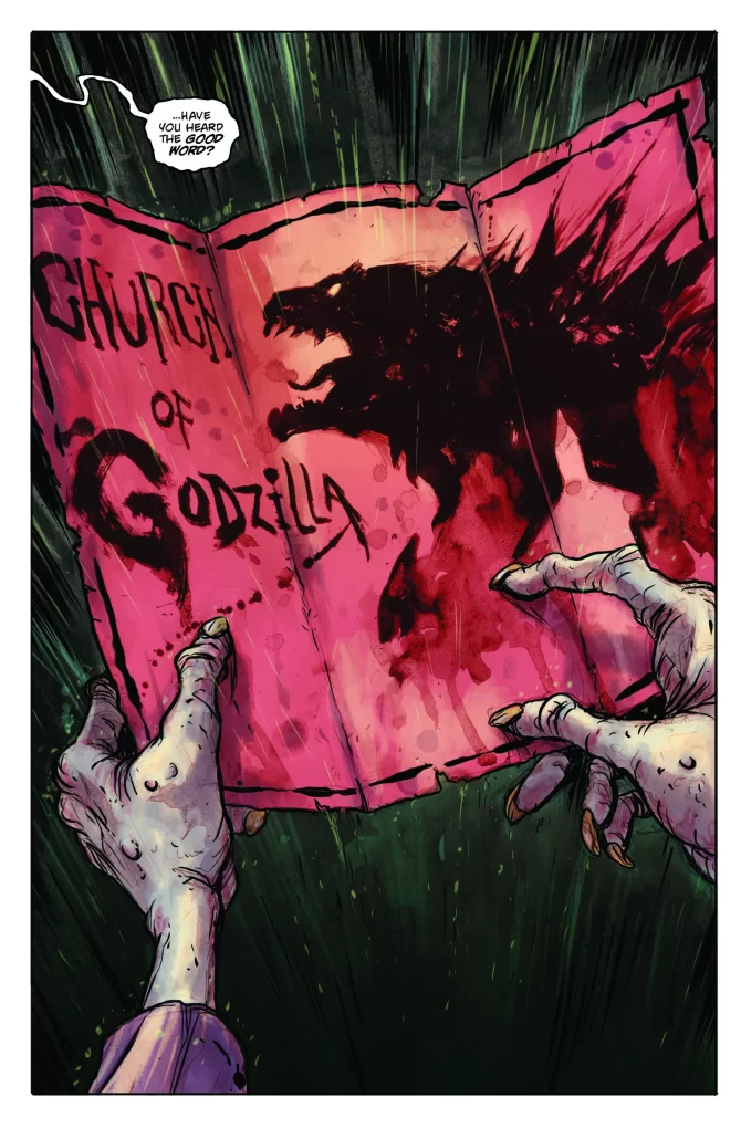 That’s the final line in what may very well be one of the greatest cold openers in Godzilla comic history. To kick off the sophomore issue of Escape the Deadzone, we’re introduced to a down-on-his-luck man who sees a potential new beginning when he accepts Godzilla into his life. Now, this isn’t just joining our community of passionate G-Fans, no, this is an entrance into a seriously sinister cult with even more nefarious plans – The Church of Godzilla! And while the fandom has joked about hearing the good word of GODzilla for eons, the IDW team has taken this literally and expanded the concept into something truly fascinating, disturbing, and strangely, something apt to our current times.