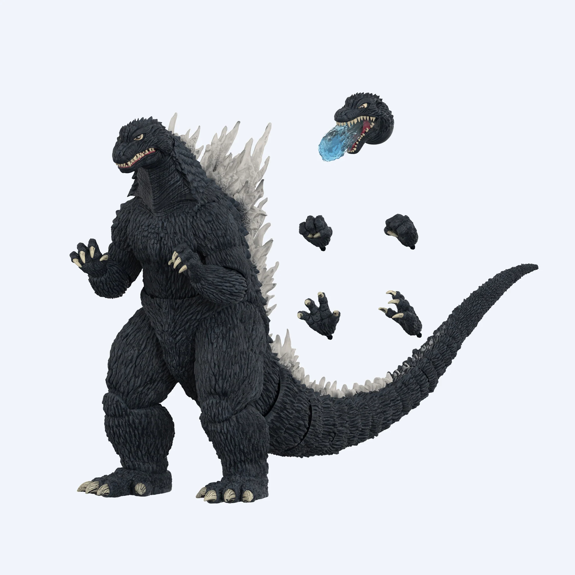 Shin Godzilla comes with two alternate heads, one of which emulating the famous and downright terrifying atomic breath sequence featured in the film. Mechagodzilla arrives with just one alternate head, but to make up for it, will include detachable arm guns and shoulder cannons featured in the film. Godzilla (2002) has the most accessories, featuring an alternate head spouting blue atomic breath and two sets of swappable hands, one of which being a clenched fist for some intense kaiju action.