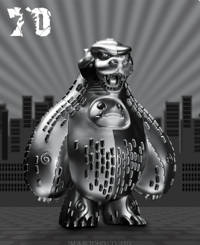 To commemorate the sunsetting of the 70th Anniversary of Godzilla celebrations, the Platinum Godzilla Chomp toy was revealed by frequent Godzilla collaborator Abominable Toys. Designed by Tom Whalen (@strongstuff), the extra special figure was only available to order for a 48-hour window beginning on November 2nd, ending at 2:00PM PST on November 4th. This extremely limited piece was a shiny, memorable collectible for those who were seeking something a little more rare to showcase in their collections.