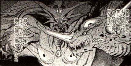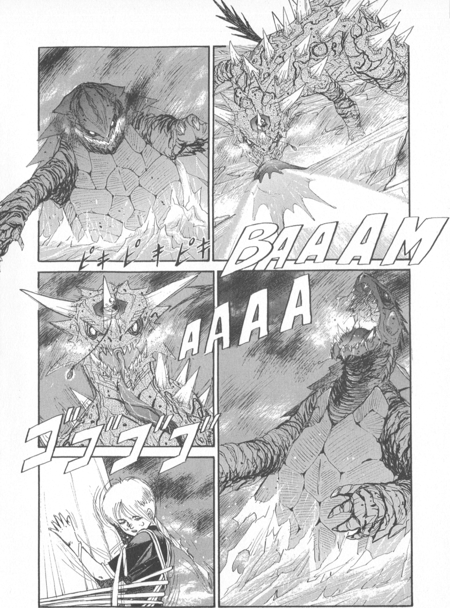 The overall narrative of Gamera 2.5 is very similar to the original 1966 film Gamera vs Barguon, but it has been molded into the Heisei zeitgeist and adds to the world of Kaneko’s Gamera. The first few pages are a manga adaptation of Gamera’s victory over Legion from Gamera 2 (1996) and the ominous consideration that Gamera is the protector of Earth, not humanity; a distinction that hauntingly makes one realize that if mankind doesn’t change its ways sooner than later, Gamera would view them as a threat no different that the Gyaos.