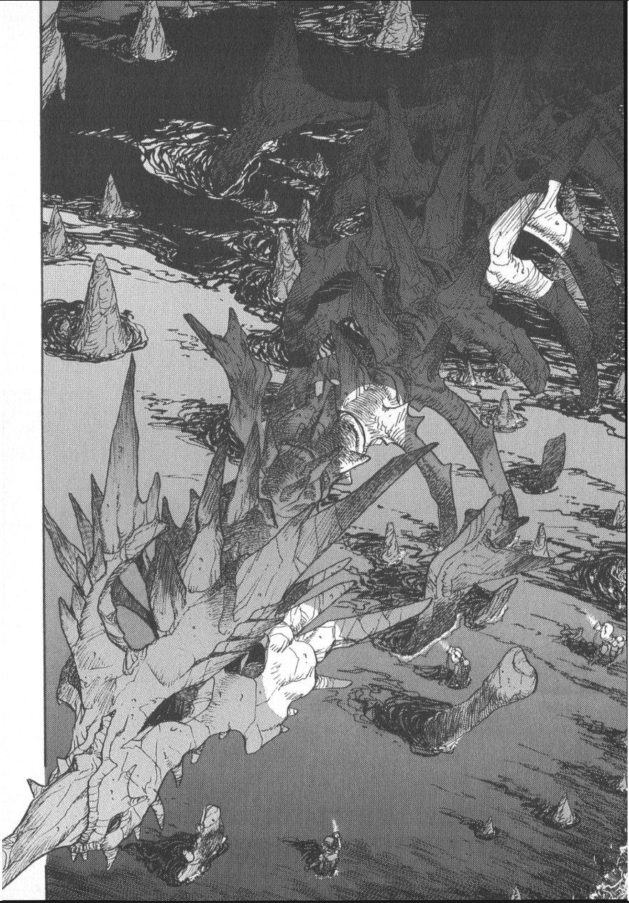 Speaking of these ancient ones, it is usually expressed in the text you can find about this comic that it explores more of the lore set up in Revenge of Irys (1999) that Gamera and Gyaos were not the only monsters built by ancient civilizations, but that they were mass-produced guardian monsters before they turned on their creators. It is true that this story does explore this worldbuilding a little more in depth than the films do, but it should be noted that it’s still a pretty brief sequence. In an almost blink and you’ll miss it page featured in the first act of the story, Kaida floats listlessly on the surface of the underground lake that is the final resting place for the original Barugon. While unconscious, he soon has dreams of the truth about the monsters that roam his world and it is shown in memorable detail.