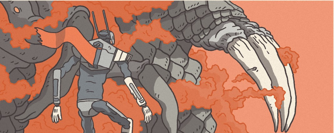 MODERN CARAPACE is an independent action-scifi comic written, illustrated, crowdfunded, and PUBLISHED by only one guy: Jacob Kuddes, a cartoonist based in Minnesota who has also done artwork for his friend’s fanzines covering lovable nerd culture like Star Wars and Pokemon. As for the topic of this article, Modern Carapace, this is a comic about a Park Ranger who protects kaiju from poachers using a giant mech suit. If that summary alone has you sold, I think you should skip to the bottom of this article and go find where you can read it RIGHT NOW. If it doesn’t, then we have a lot of ground to cover here anyway. Good thing we have two giant robot legs to work with! Three issues are already completed and available, but for this article I’m only going to go into the first issue, because I really want you to be reading the comic instead!