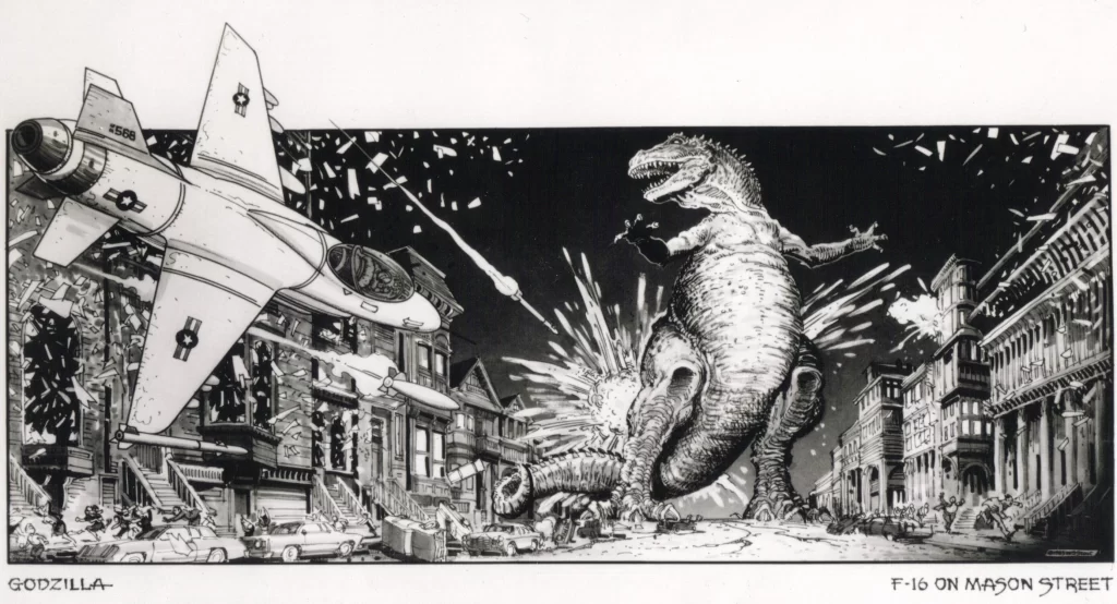 In 1983, film director Steve Miner (Friday the 13th Part III, Lake Placid) acquired the North American rights to produce an American Godzilla film. After shopping it around to various studios, he hired Fred Dekker (The Monster Squad) to develop a screenplay and William Stout (Creepshow) to handle the concept art & storyboards. Ultimately, Miner could not secure funding from a studio to develop this feature, and it was shelved. What Americans ended up getting was a localized version of 1984’s The Return of Godzilla, referred to as Godzilla 1985.